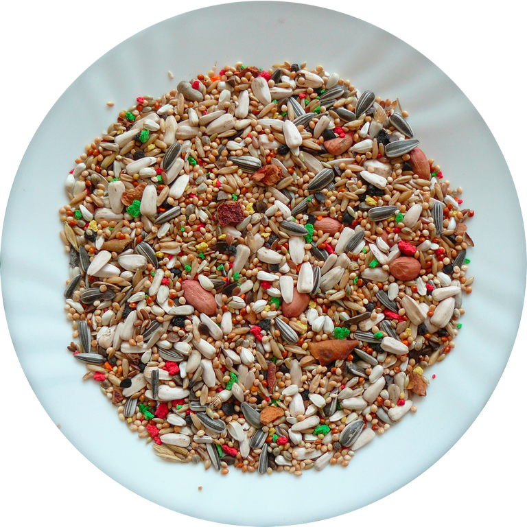 slnečnica biela, ovos nahý, proso žlté, svetlice farbiarske, proso biele, slnečnice žíhaná, proso červené, lesknice, extrudované obilniny,