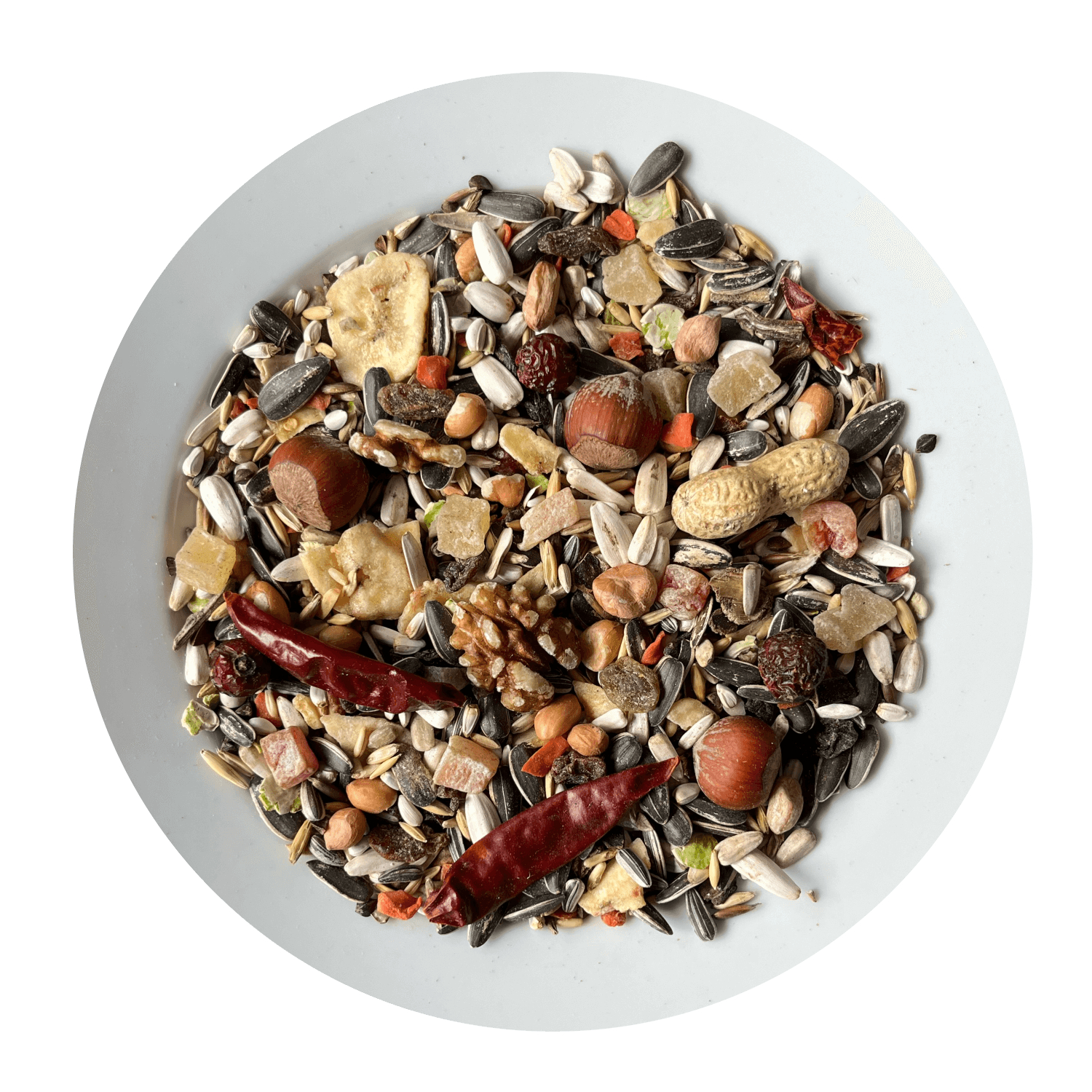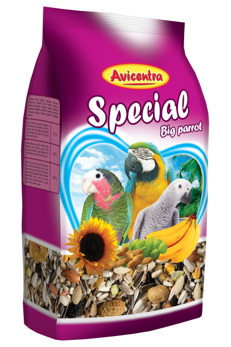 ovocie (banány, papája, ananás, hrozienka, šípky), orechy (lieskové orechy, vlašské orechy, arašidy), slnečnica žíhaná veľká, slnečnica biela, svetlice farbiarska, ovos nahý, slnečnica žíhaná, pohánka, hrachové vločky, ovocím, paddy ryže, svätojánsky chlieb, sušená mrkva, chilli papričky